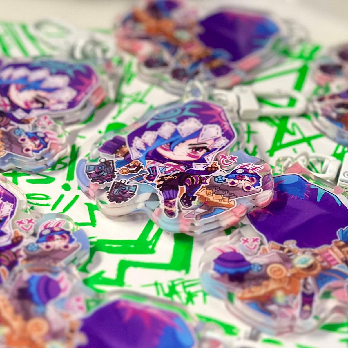 A special acrylic charm featuring Jinx in her Act 3 outfit with her Rhino gun and Isha doll!
